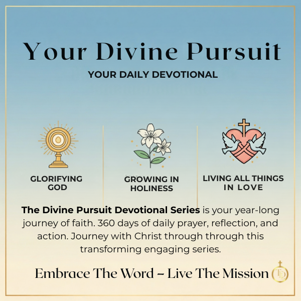 The Divine Pursuit Devotional Series is a year-long journey of faith designed to guide you step by step in living more fully for Christ. Each volume is 40 days in length, with three volumes in every category, covering a full 360 days of devotion. A new set of volumes is released every 120 days, keeping your prayer life fresh and consistent. The first three volumes invite you into the heart of discipleship: Doing All Things to Glorify God, Growing in Holiness, and Living All Things in Love. Together, they form a powerful rhythm of daily reflection, prayer, and action that keeps you rooted in the presence of God all year long.
